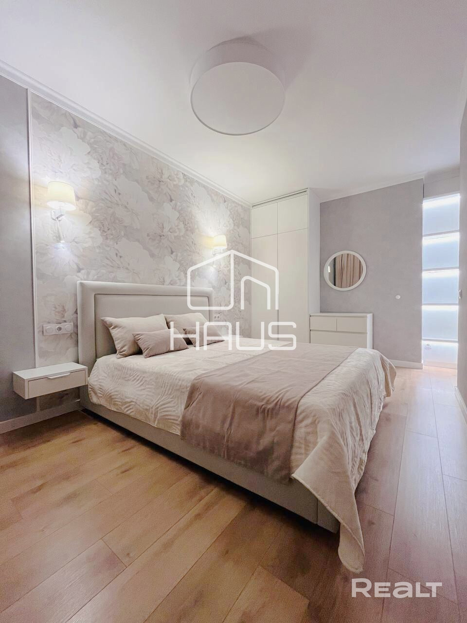 В спальне вас ждет большая и дорогая двуспальная кровать с мягким велюровым подголовником и подъемным механизмом. В комнате также есть шкаф, комод и стол.
