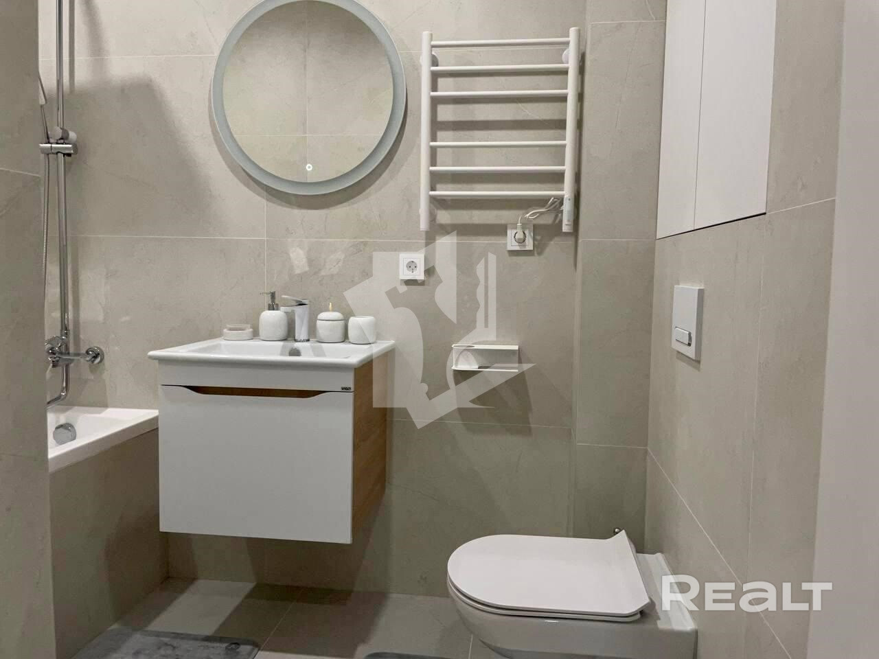 -В ванной комнате присутствует ванна, зеркало с подсветкой, подвесной унитаз, электрический полотенцесушитель, подвесной умывальник с местом хранения.