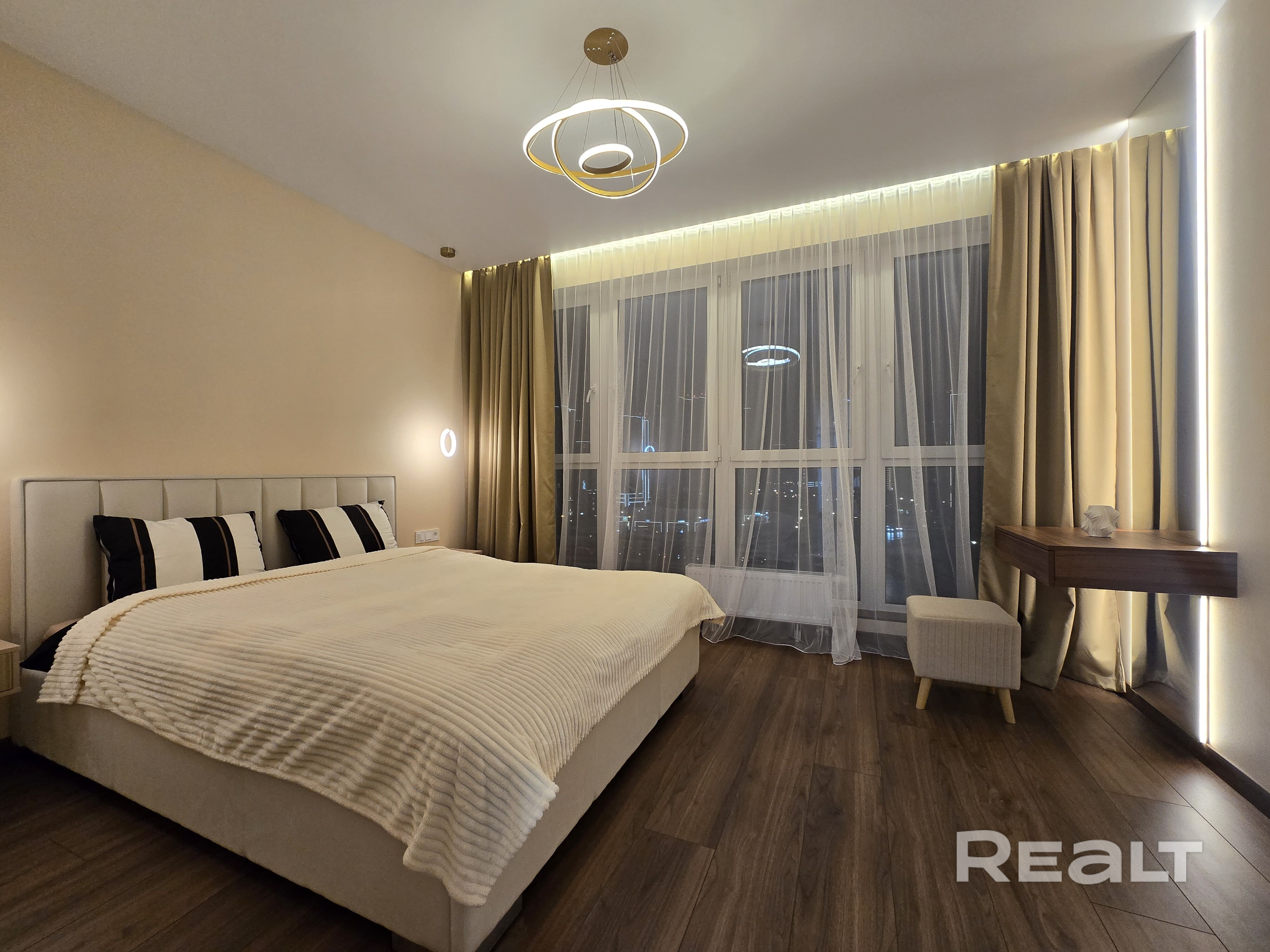 Две спальни + кухня-гостинная, гардеробная, отдельная ванная и туалет. Полностью укомплектована: кондиционер, стиральная и посудомоечная машины, бойлер, пылесос, посуда, полотенца, постельное бельё, вешалки, гладильная доска, сушилка для одежды и т.д. Удобное и удачное расположение на границе Минск-Мир - Воронянского. Остановки прямо рядом с домом. Шикарное естественное освещение, из окон виден рассвет и закат. Вид не перекрывается ближайшими домами.