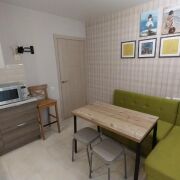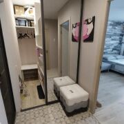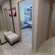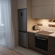 - В квартире есть вся необходимая мебель, бытовая техника: холодильник, стиральная и посудомоечная машины, духовой шкаф, свч-печь, большой телевизор, экран для проектора, пылесос. Планировка функциональная - жилая комната и кухня изолированные, есть просторная гардеробная.
