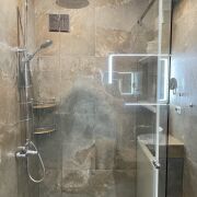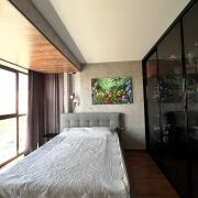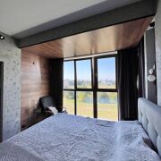 Просторная гардеробная в спальне за стильными тонированными раздвижными дверьми