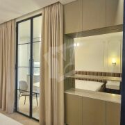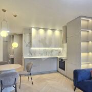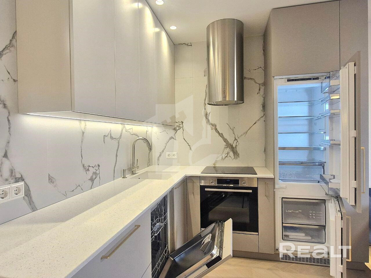 Полностью оборудованная кухня: духовой шкаф, варочная панель, микроволновка, вытяжка, посудомоечная машина.