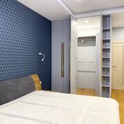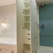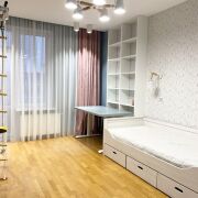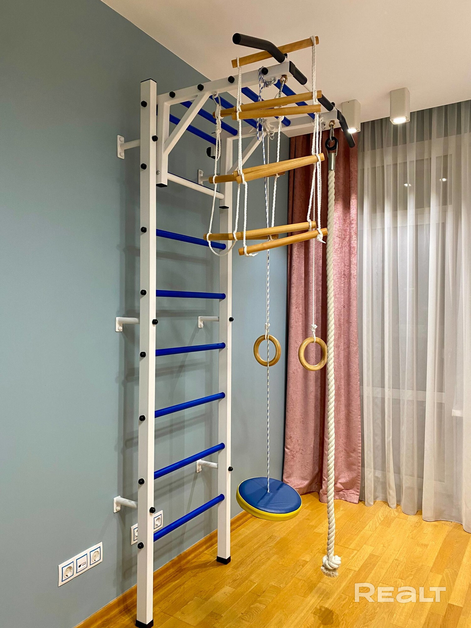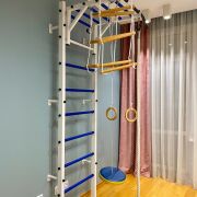 Уютная спальня с кроватью из массива дуба и вместительной гардеробной. Детская комната: односпальная кровать, шведская стенка и стол с регулируемой высотой. Кабинет: диван-кровать и стол.