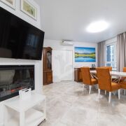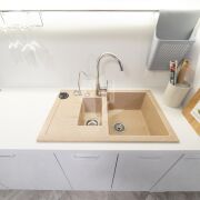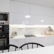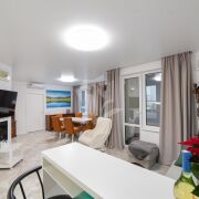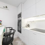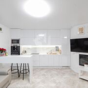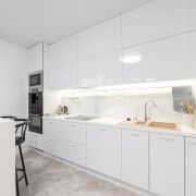 Делалось все для себя, поэтому в квартире продумала каждая мелочь: встроенная кухня с качественной фурнитурой, итальянская мебель, кожаный диван, качественные материалы без использования пластика. Барную стойку, выполненную из камня, также можно использовать как рабочее место (подведены розетки). По всей квартире проведена вентиляция и шумоизоляция