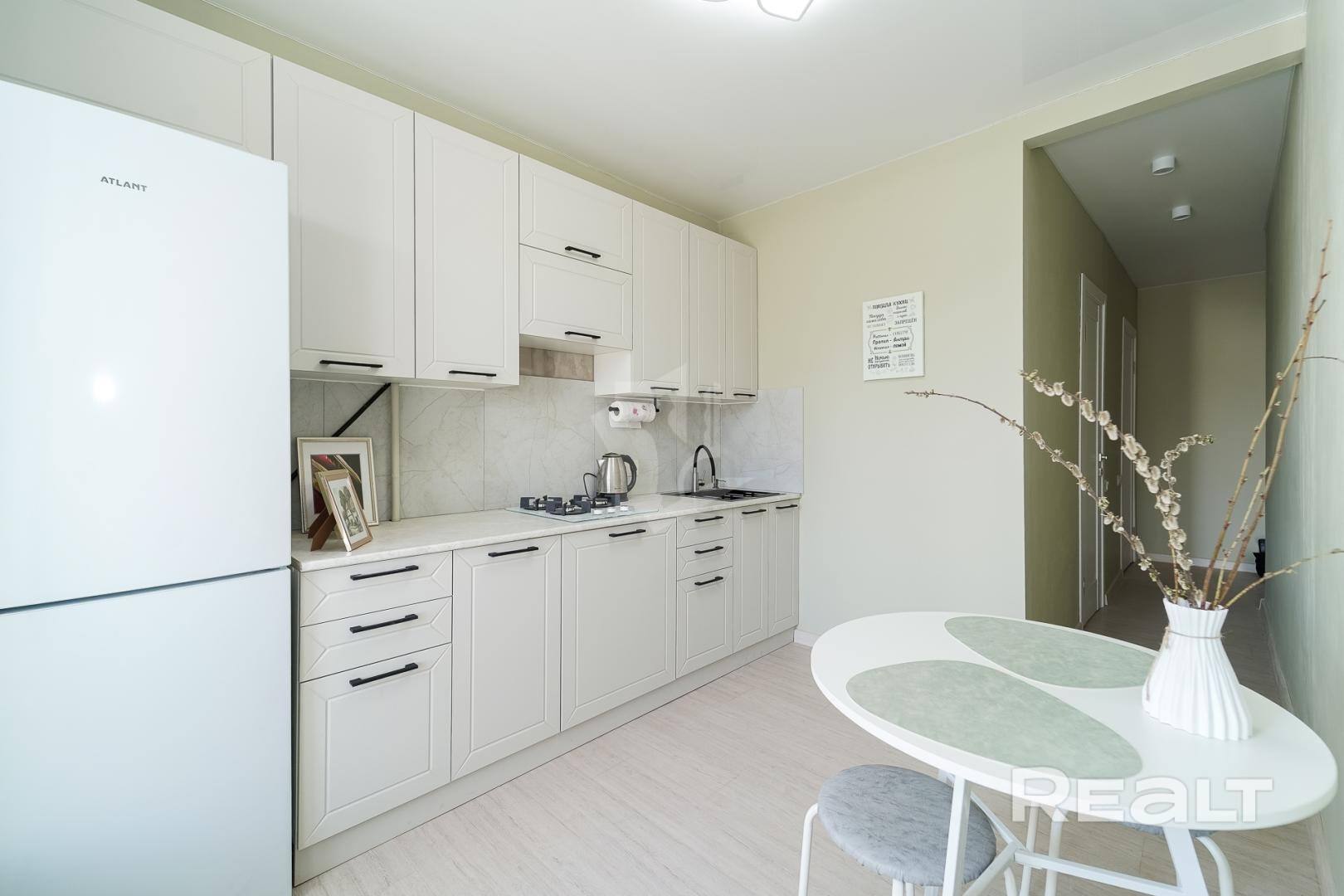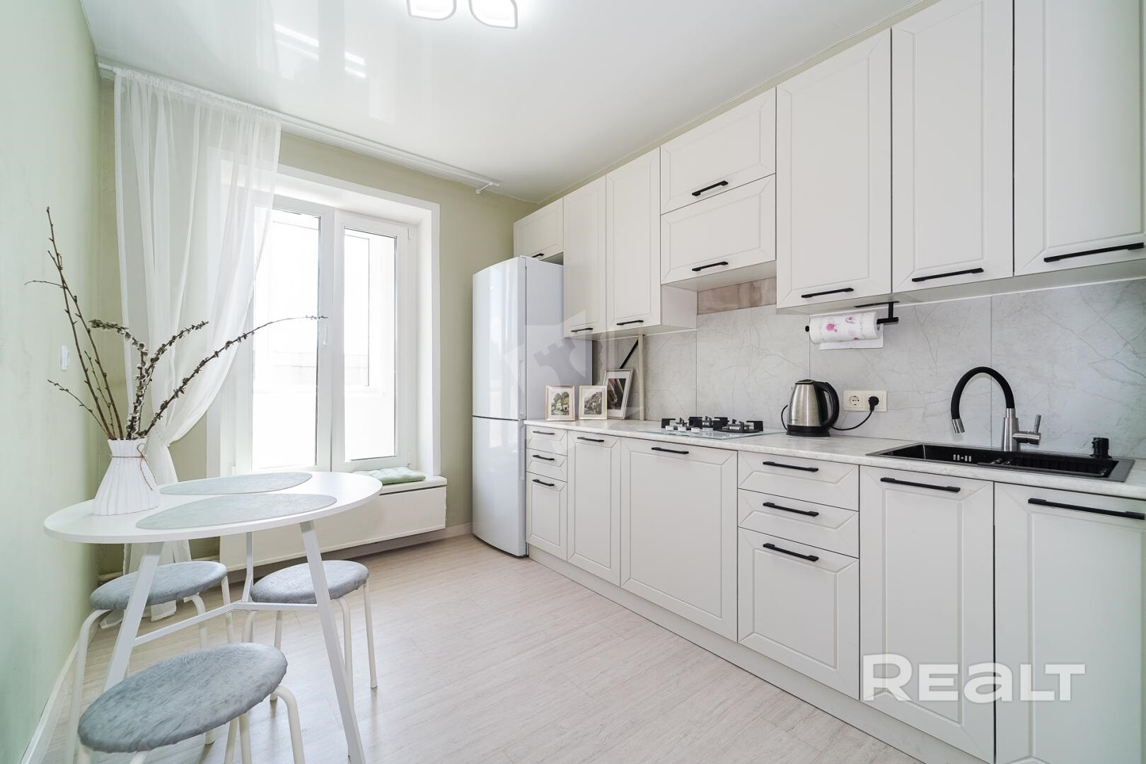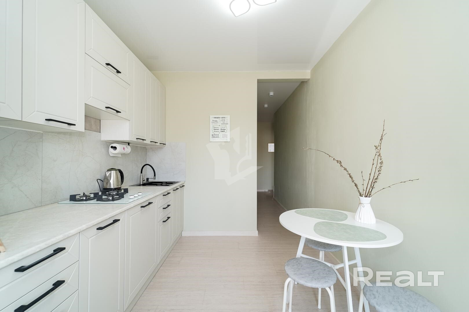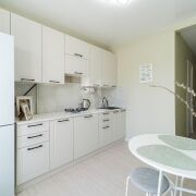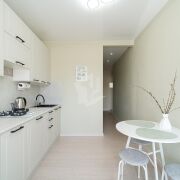 Кухня оборудована современным гарнитуром и всей необходимой техникой. Квартира укомплектована всем, что нужно для комфортного проживания. Гардеробная комната и вместительный шкаф позволят разместить все ваши вещи. Так же есть отдельная постирочная комната.