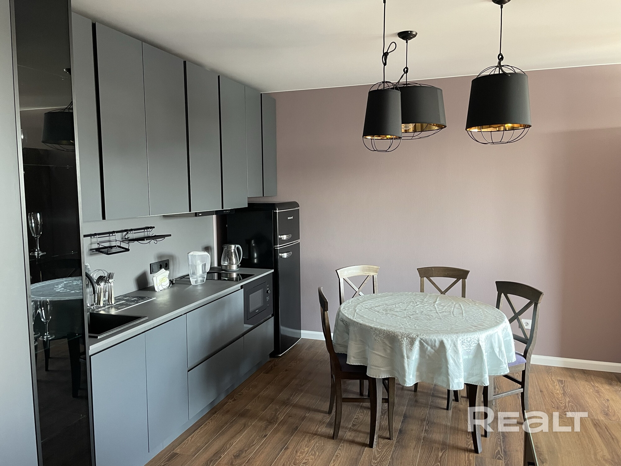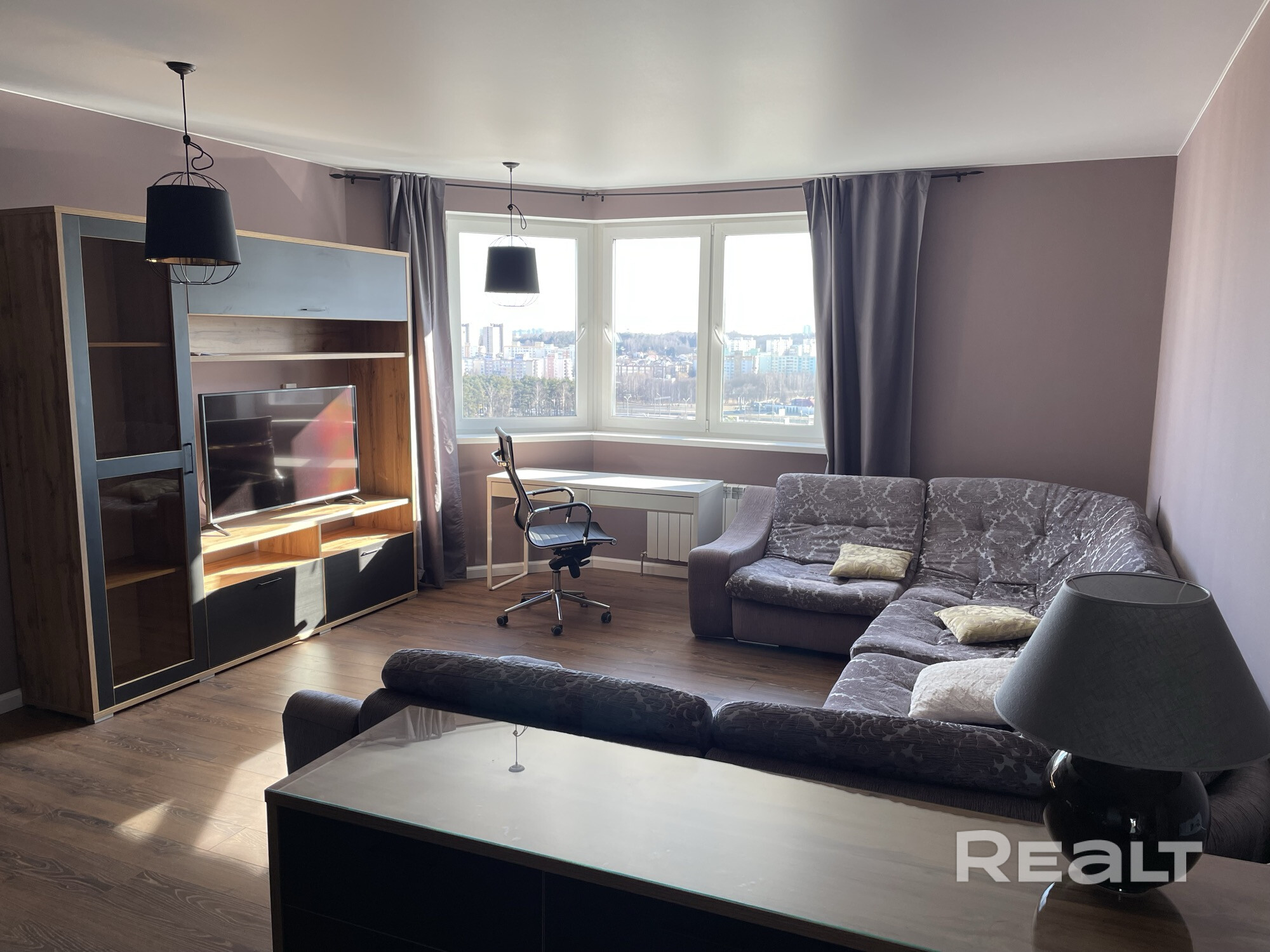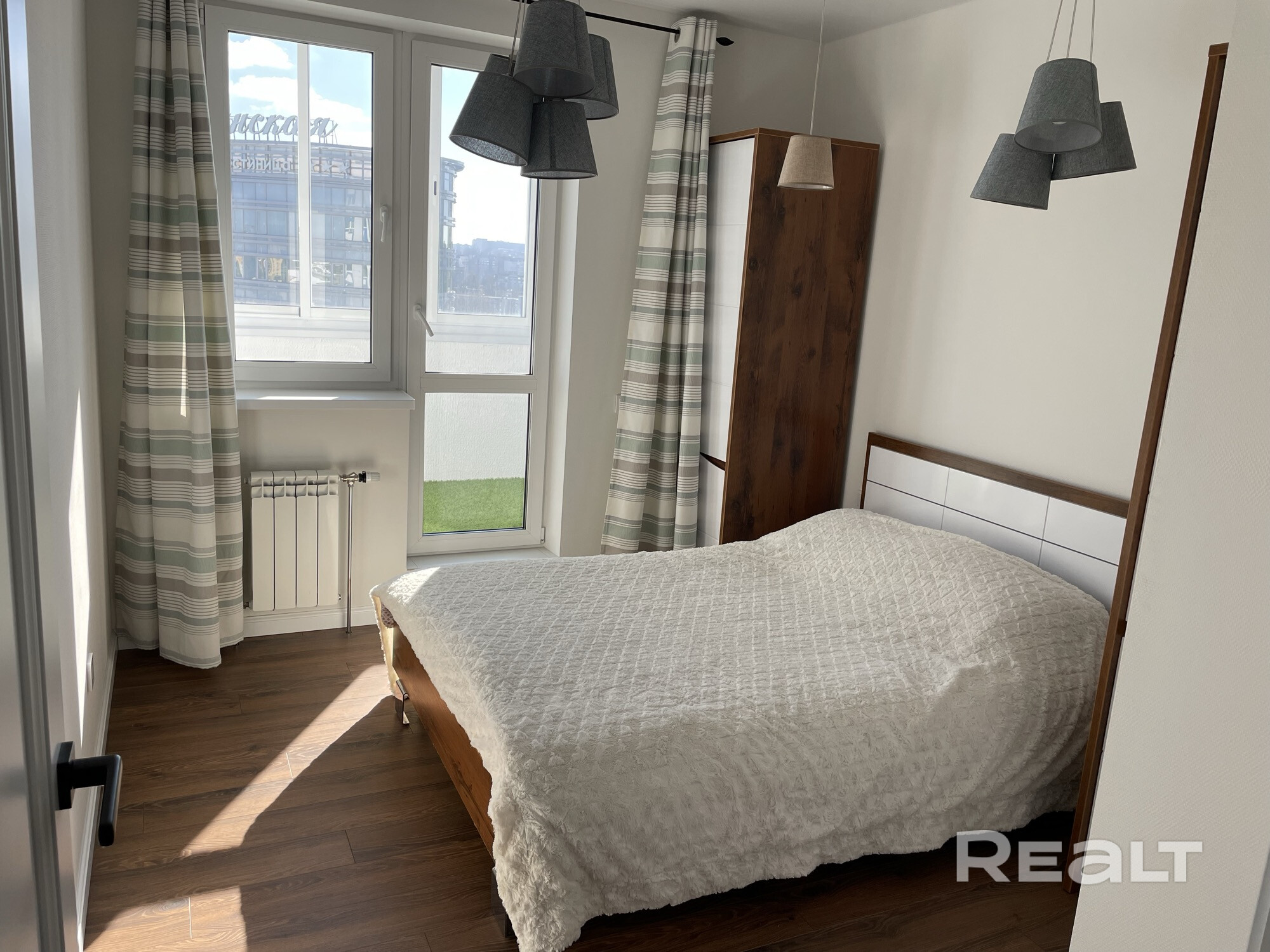 На длительный период сдается просторная 2-комнатная квартира общей площадью 55 м2, жилой с кухонным оборудованием на 16-м этаже 22-этажного каркасно-кирпичного дома 2019 года постройки на улице Нарочанская, 4. - Удачная планировка: большая кухня-гостиная, компактная спальня и раздельный санузел. Кухня-гостиная площадью 32.5 м2 обустроена всей необходимой мебелью (встроенный кухонный гарнитур, диван) и техникой (холодильник, варочная панель, духовой шкаф, микроволновая печь, вытяжка); - Встроенны