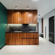 Кухня: стильная столешница из ламинированного МДФ, фасады кухни отделаны натуральным шпоном ореха, что придает интерьеру изысканность и теплоту, фурнитура Blum – гарантия долговечности и безупречной работы.