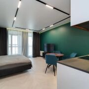 Гостиная и спальная зона: на полу уложен практичный и стильный кварцвинил, натяжные потолки с теневым профилем, трековые светильники и различные сценарии освещения позволяют настроить атмосферу под ваше настроение. Большое количество скрытых систем хранения – порядок и удобство в каждой детали. Установлен кондиционер – комфорт в любое время года. Стены окрашены моющейся краской – легко поддерживать чистоту.