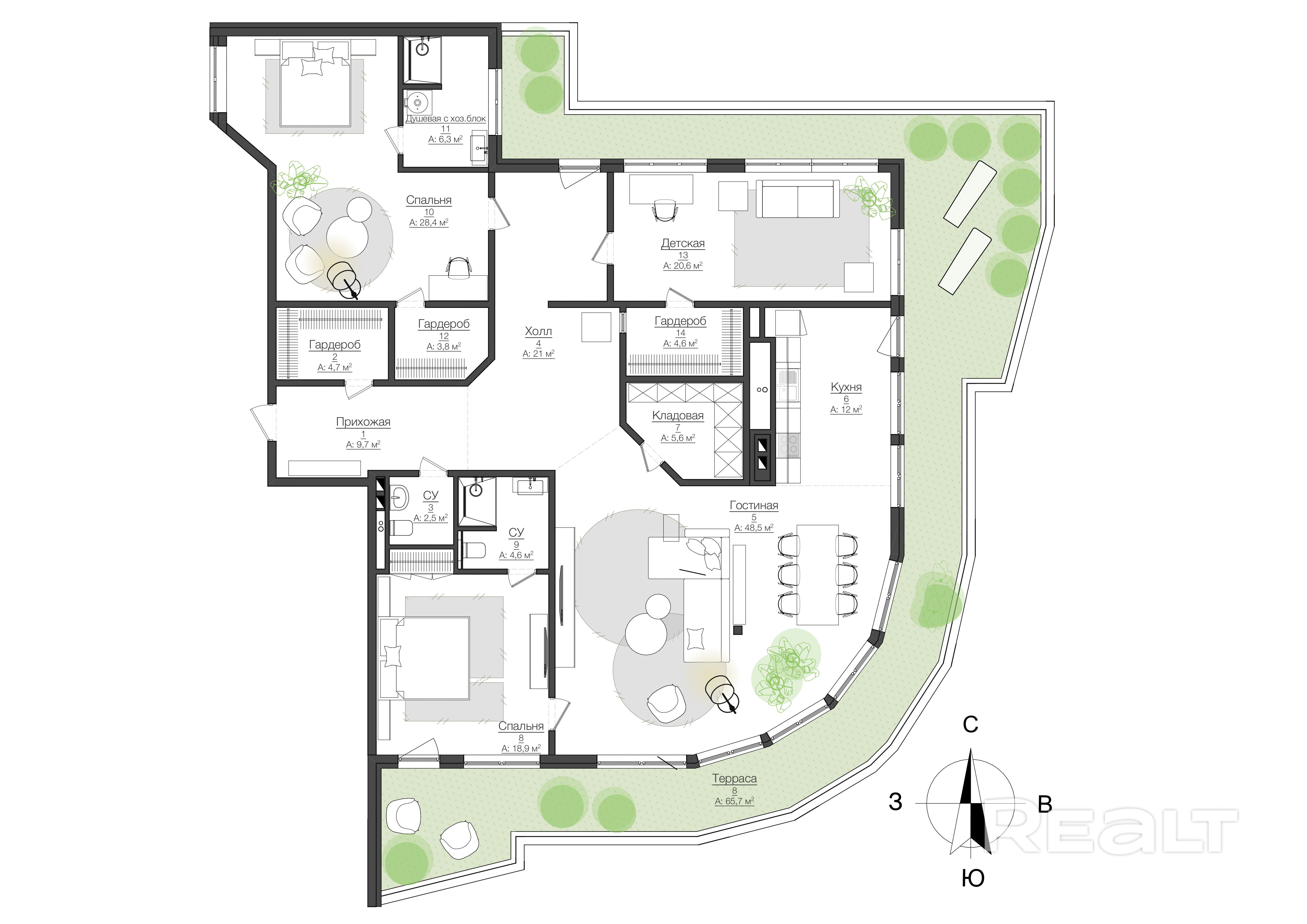 Просторная планировка: большая гостиная с панорамными окнами, 3 изолированные спальни, полноценная кухня-столовая.