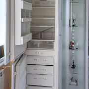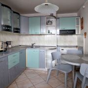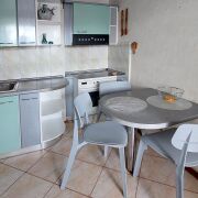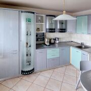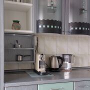 Кухня: встроенный двухкамерный холодильник «Вирпул», электроплита «Бош» с духовым шкафом, микроволновая печь «Самсунг», электрочайник, кофеварка, настольный фильтр для воды, набор посуды, кухонный гарнитур, обеденный стол и стулья.