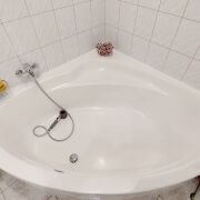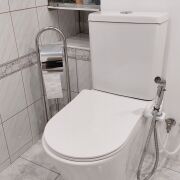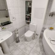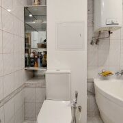Санузел (совмещенный): угловая ванна, унитаз с функцией гигиенического душа, стиральная машина «Самсунг», умывальник с зеркалом, водонагревательный бойлер, счетчики учета воды.