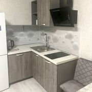 В квартире: мебель, варочная панель, вытяжка, холодильник, телевизор.