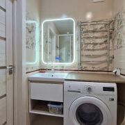 Санузлы уровня SPA: ванна с гидро- и аэромассажем, современная душевая система, умное зеркало (подсветка, антизапотевание, радио, Bluetooth). Есть стирально-сушильная машина.