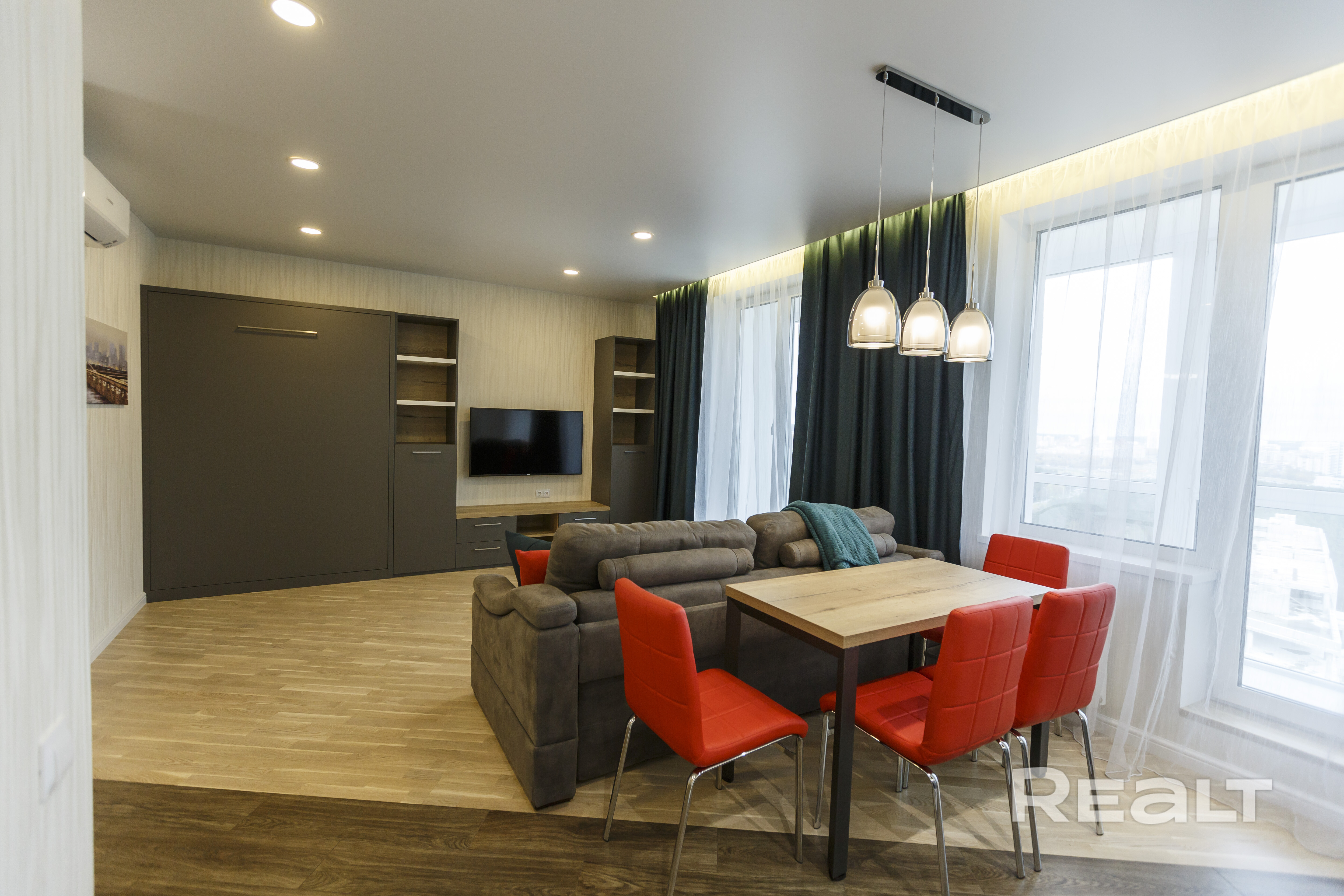 Квартира в современном ЖК рядом с метро и всей инфраструктурой. Более удобного месторасположения не найти. Шикарный вид с высокого этажа на проспект и торговый дом Першы. Есть вся техника : посудомоечная машина, стиралка, кондиционер , посуда и мелкие приборы домашнего обихода. Постельные принадлежности, кухонная посуда, и все для комфортной жизни.