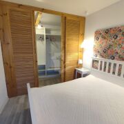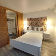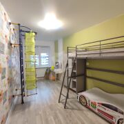 В спальной комнате отдельная гардеробная, двуспальная кровать. Детская комната оборудована двумя детскими кроватями, столиком и детским спортивным комплексом.