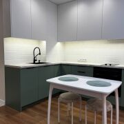 кухонная бытовая техника (встроенный холодильник, варочная панель, духовой шкаф, минимальный набор посуды, вытяжка, место для посудомоечной машины);