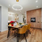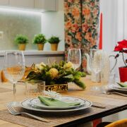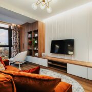 Большая гостиная совмещена с кухней, которая полностью укомплектована всей необходимой техникой мировых производителей (холодильник, духовой шкаф, кофемашина, посудомоечная машина) и посудой. Благодаря дизайнерскому решению в гостиной выделена ТВ зона с диваном, который легко превращается в спальное место.