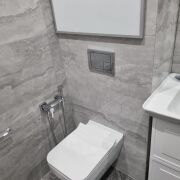 Санузел облицован современной плиткой. Установлена душевая кабина, стиральная машина.