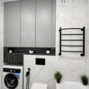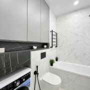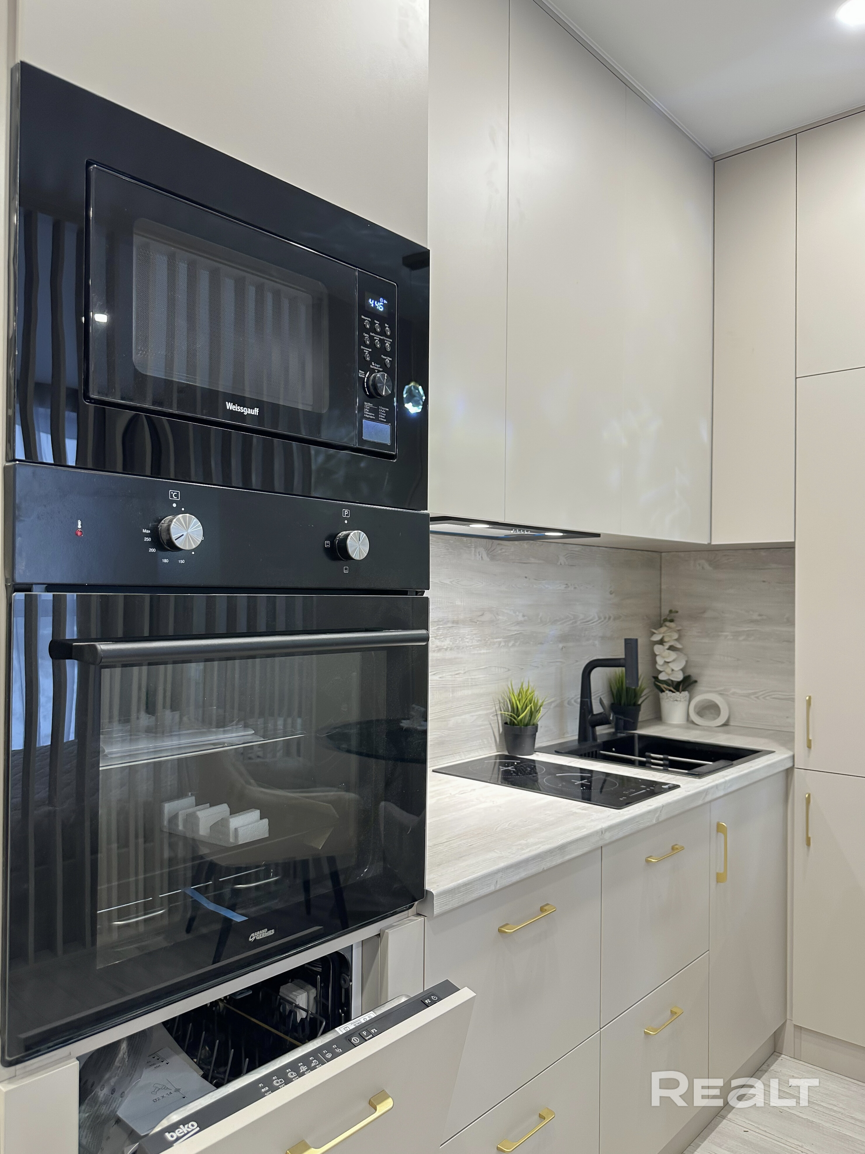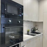 Квартира полностью укомплектована техникой и мебелью: индукционная варочная панель Schtoff, духовой шкаф Germes, СВЧ Weissgauff, вытяжка Germes, посудомоечная машина Beko, встроенный холодильник стиральная машина, bosch телевизор со Smart TV, раскладной диван и большой шкаф-купе.
