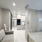 Студия имеет грамотное зонирование: выделены зоны кухни, гостиной, коридора, а также отдельное спальное место, что делает пространство максимально функциональным и уютным.