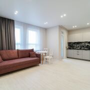 Описание Сдается на длительный срок стильная и уютная студия в современном ЖК "Левада". Эта квартира – настоящая находка для тех, кто ценит комфорт, эстетику и практичность. Что вас ждет? Кухня-гостиная: сердце квартиры Просторная и светлая зона объединяет кухню и гостиную, создавая идеальное пространство для отдыха и встреч с друзьями. Мебель выполнена на заказ, с максимальной точностью использован каждый сантиметр пространства, что делает интерьер максимально функциональным и гармоничным.