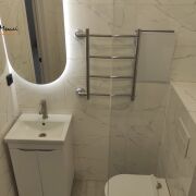 В квартире сделана отделка стен декоративной штукатуркой. Розетки и выключатели Schneider Electric. Сделано основное, вечернее и декоративное освещение. Натяжные потолки. В санузле установлена стеклянная душевая, зеркало с подсветкой, полотенцесушитель, стены и пол выполнены из качественного керамогранита. Установлена качественная входная дверь, входная группа на полу выполнена из плитки и переходит в ламинат.