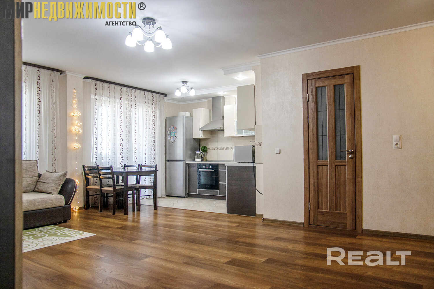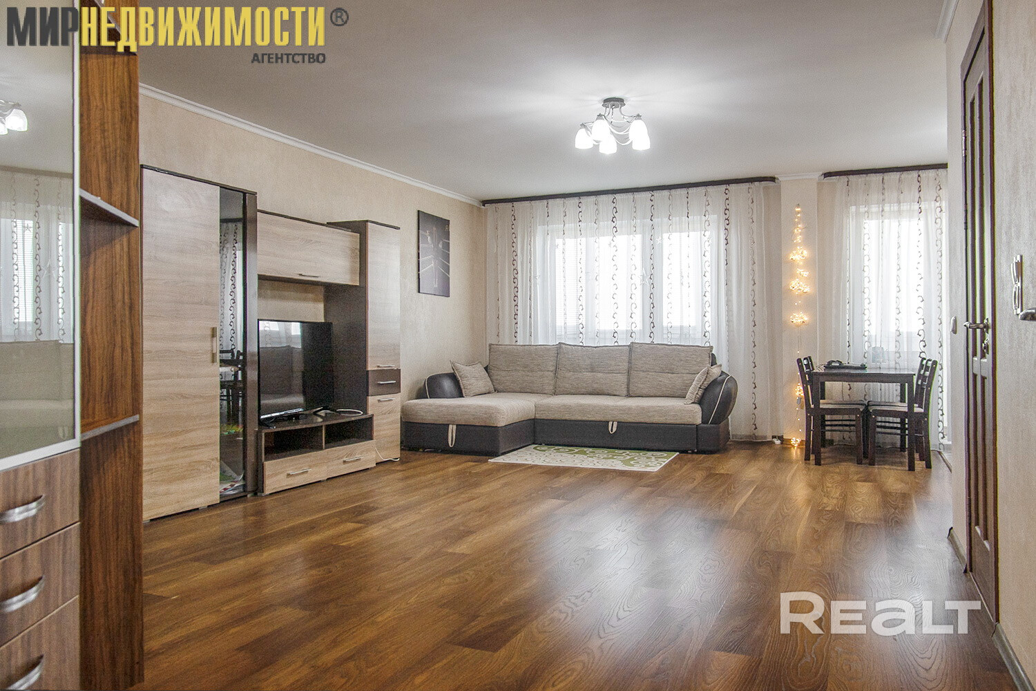 Площадь комнаты с кухонным оборудованием 39.0 кв.м. В квартире сделан хороший ремонт, вся мебель есть, бытовая техника, 3 балкона, с/у раздельный, шикарный вид из окон, хорошие соседи, чистый, аккуратный подъезд, шлагбаум, хорошо развита инфраструктура, магазины, кафе, парикмахерские, школа, сад, рядом Минск-Арена, парк Дрозды.