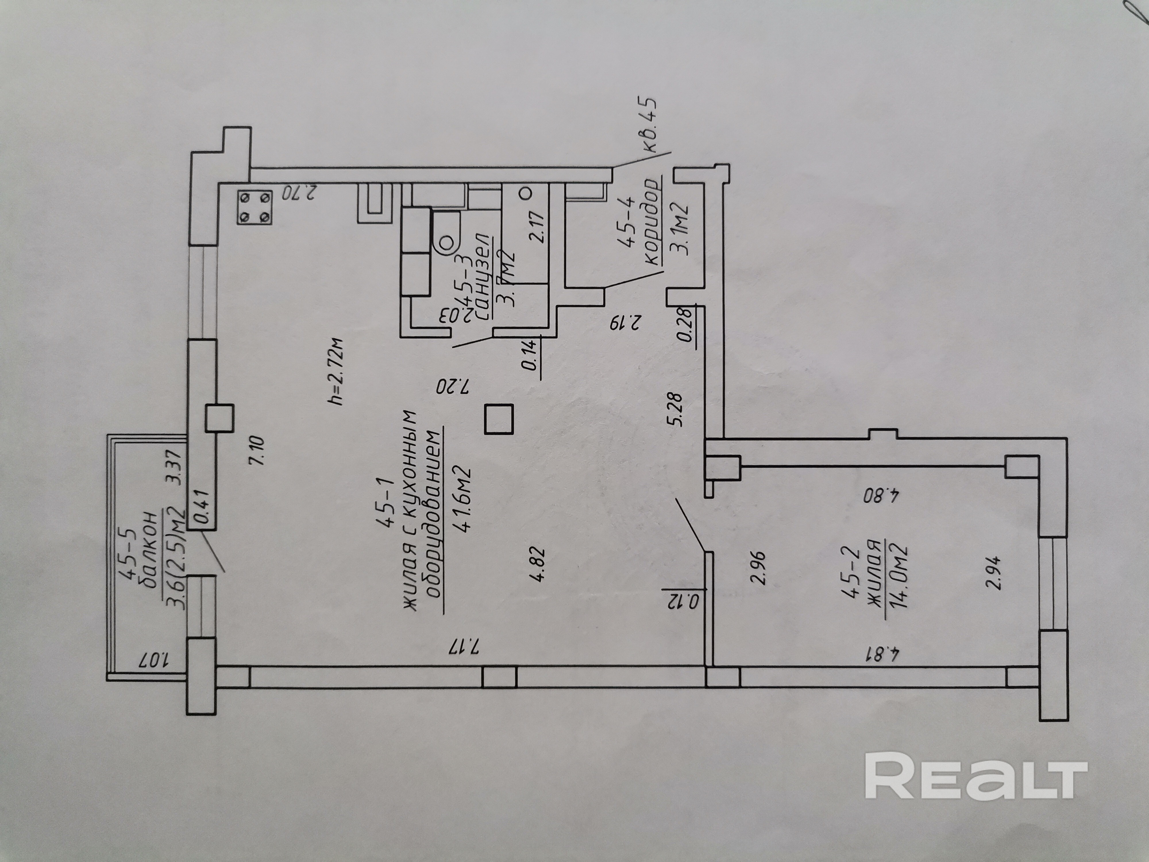 Большая кухня 41.6 кв. метров совмещенная с залом, отдельная спальня ,санузел, балкон. 1 этаж 9 этажного дома 2012 г. постройки.