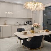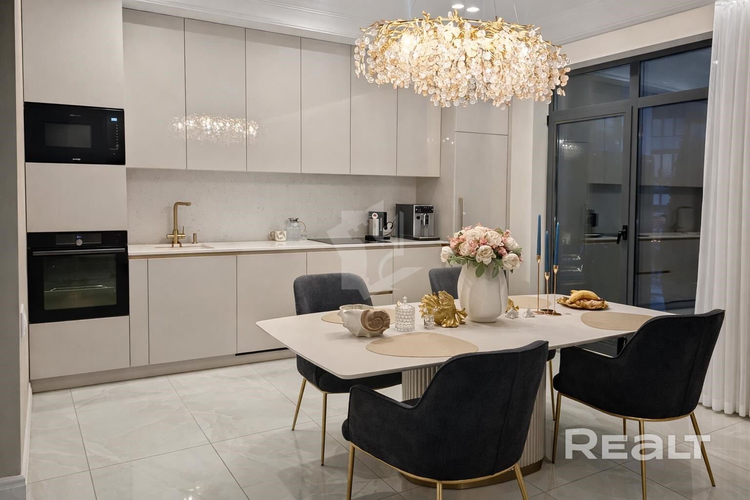 Просторная кухня-гостиная с дизайнерской мебелью и встроенной техникой