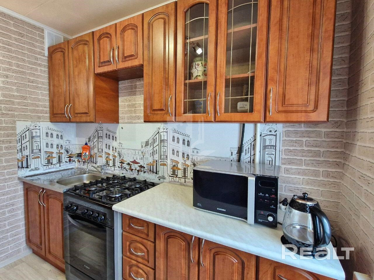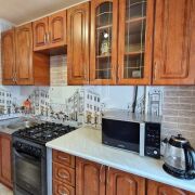 Просторная кухня, полностью оборудованная всей необходимой техникой: газовая плита с духовкой, вытяжка, холодильник, микроволновая печь, электрочайник.