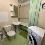 -Совмещенный санузел облицован плиткой и оснащен стиральной машиной, а на входе в квартиру установлена металлическая дверь.