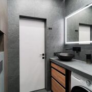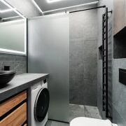 Санузел: на полу и стенах уложен крупноформатный керамогранит, в душевой трап в полу и перегородка из закаленного стекла. Установлен накопительный бойлер – горячая вода всегда в наличии. Встроенные смесители и тропический душ.