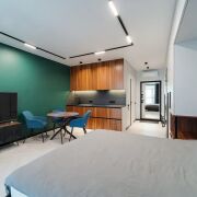 Панорамный вид на здание старого аэропорта – уникальная атмосфера и вдохновение каждый день. Эта студия – идеальное сочетание стиля, функциональности и уюта. Не упустите шанс сделать ее своим новым домом!