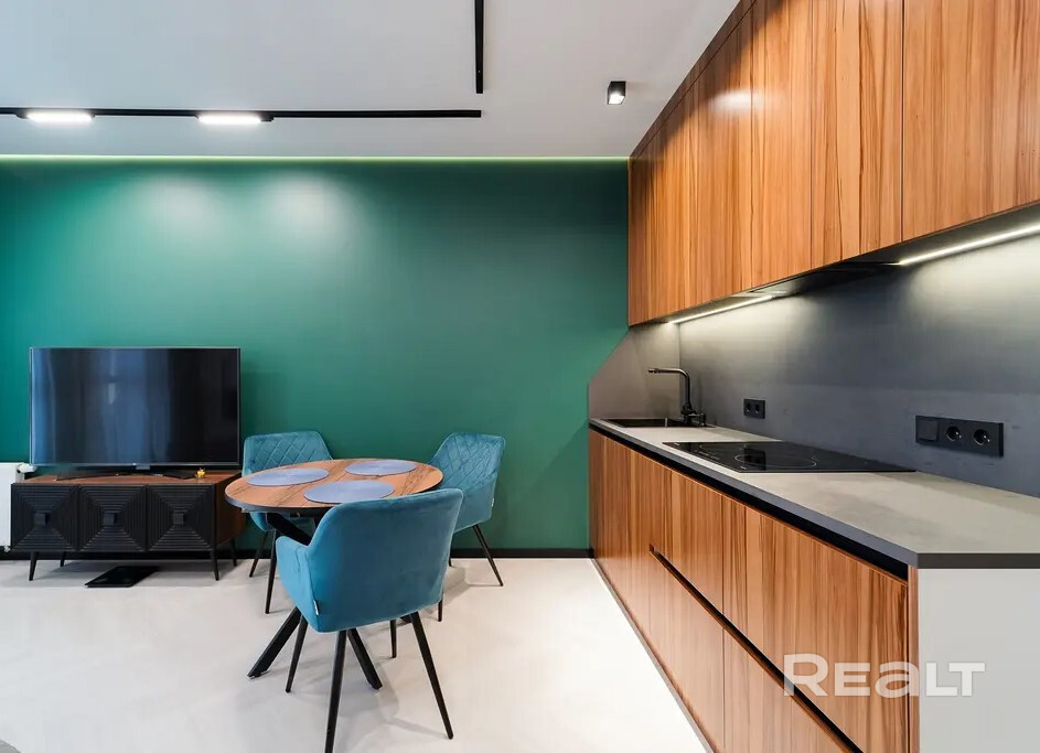 Кухня: стильная столешница из ламинированного МДФ, фасады кухни отделаны натуральным шпоном ореха, что придает интерьеру изысканность и теплоту, фурнитура Blum – гарантия долговечности и безупречной работы.