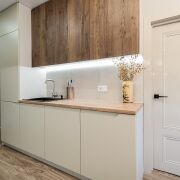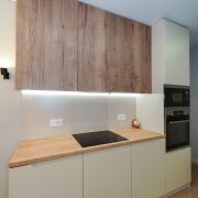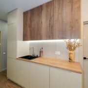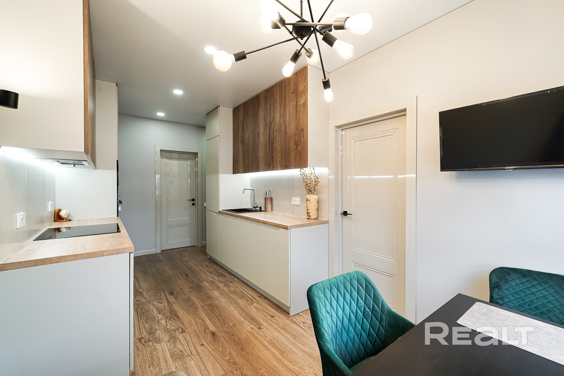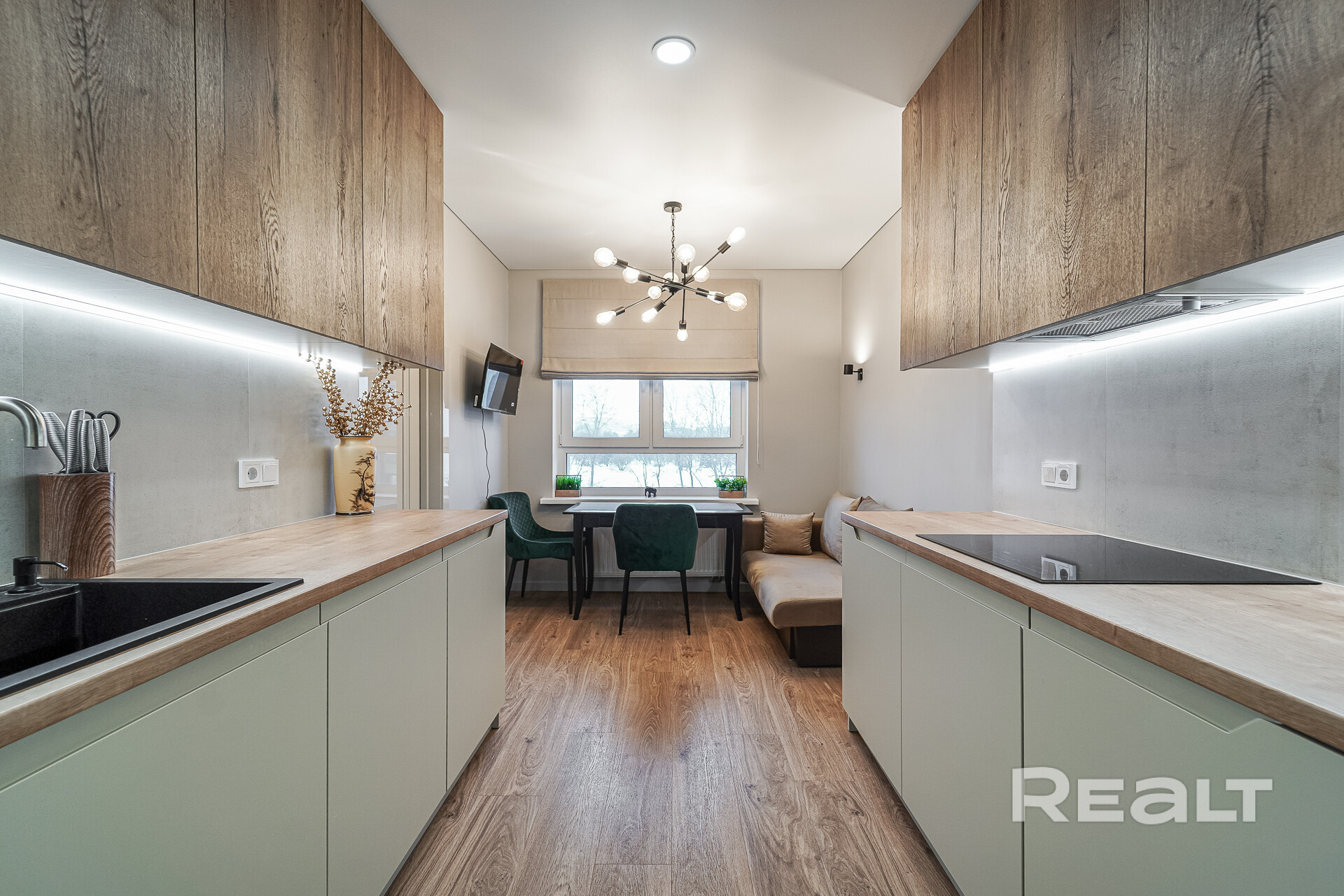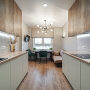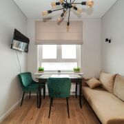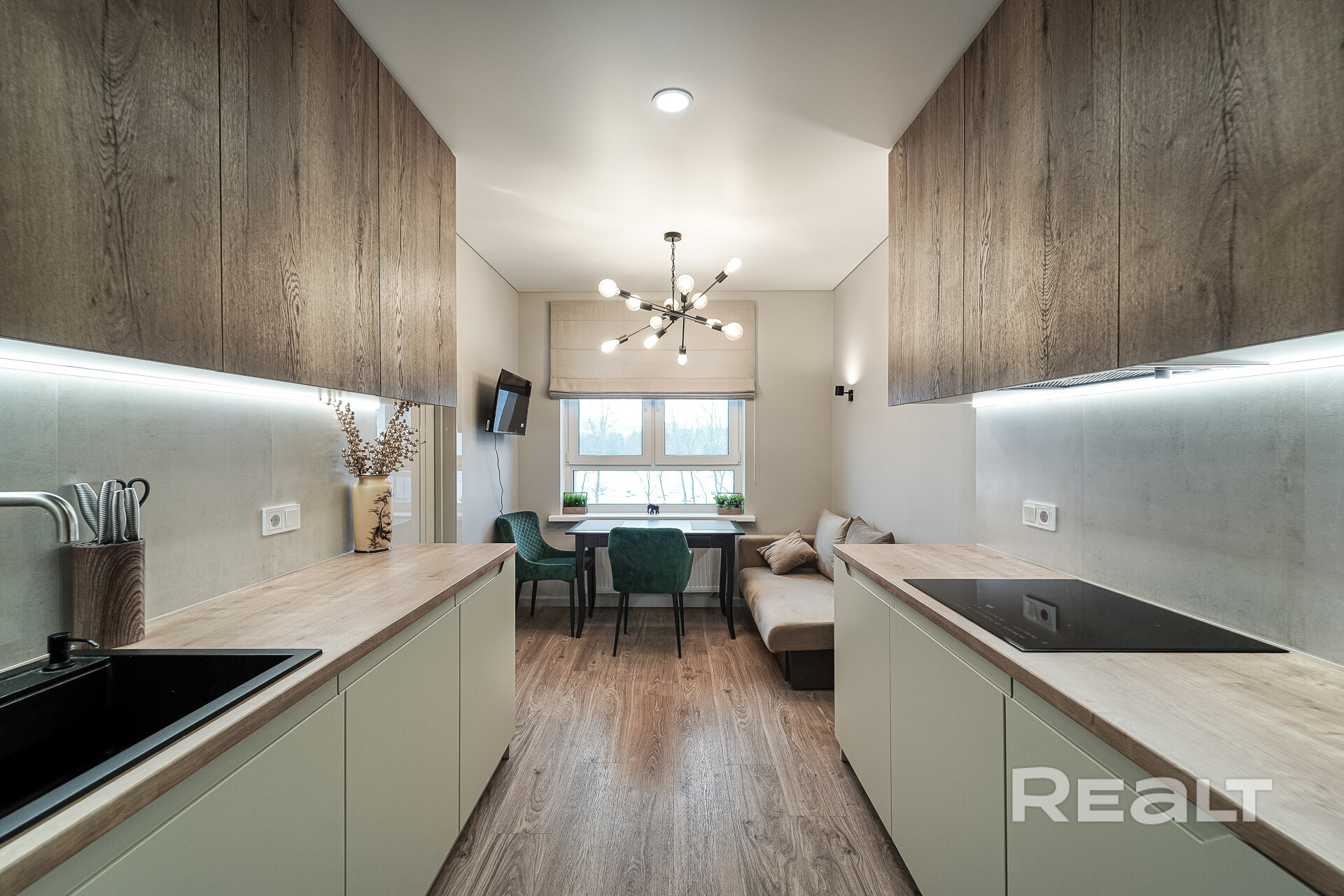 Кухня: изолирована отжилого пространства ипредставляет собой полноценную комнату площадью 13.9 м2. Кухня вместила в себя рабочее пространство и столовую зону с местом для отдыха. Кухня оснащена всей импортной мебелью и техникой: холодильник, духовой шкаф, индукционная панель, микроволновая печь, вытяжка и посудомоечная машина. В столовой зоне размещен телевизор, стол, комфортабельные кресла и раскладной диван – дополнительное место для размещения гостей. Идеальное место для посиделок с семьей или дорогими друзьями.