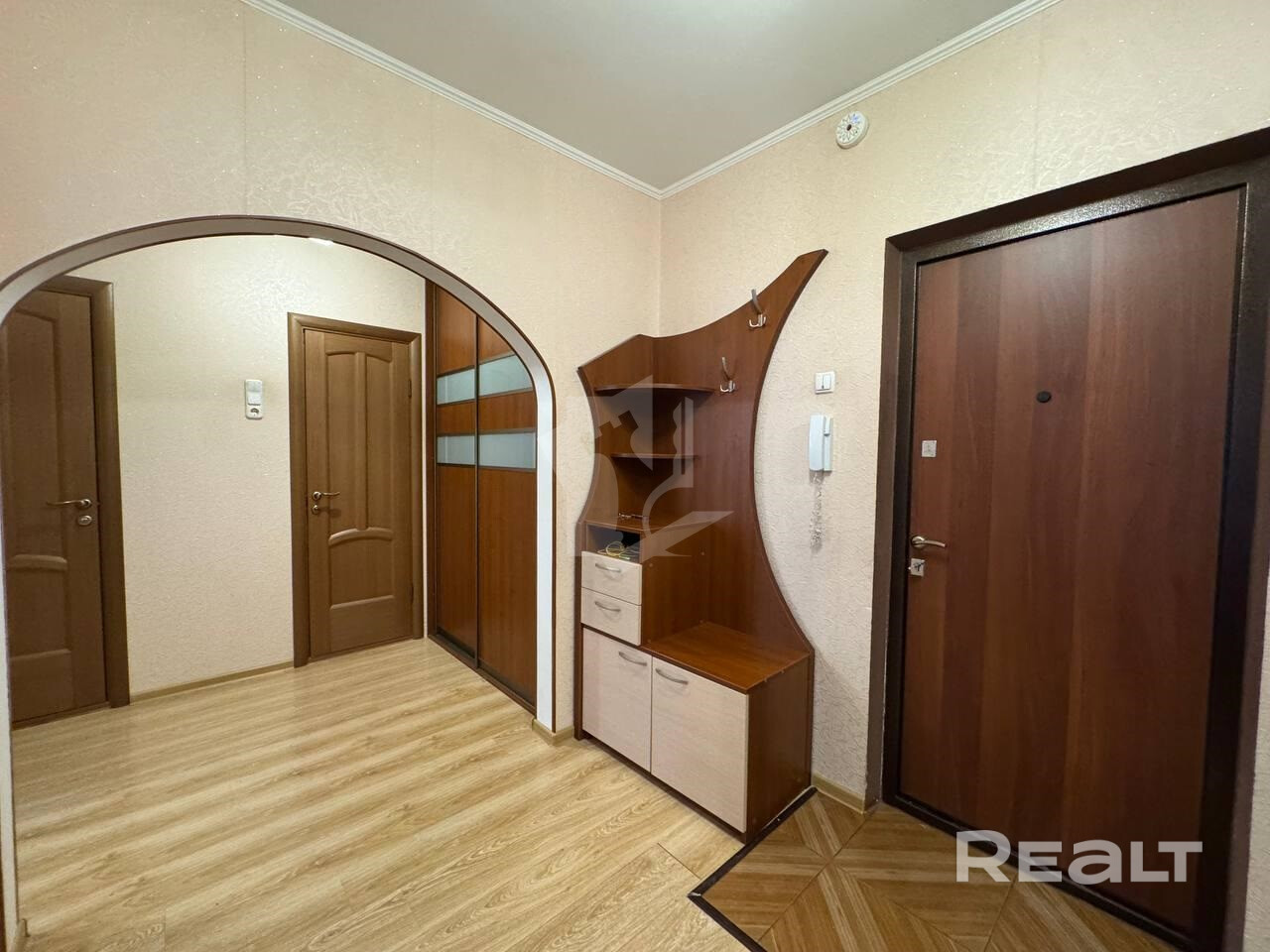 В квартире присутствует вся необходимая мебель: диван, мебельная горка, шкаф для одежды, кухонные шкафы,