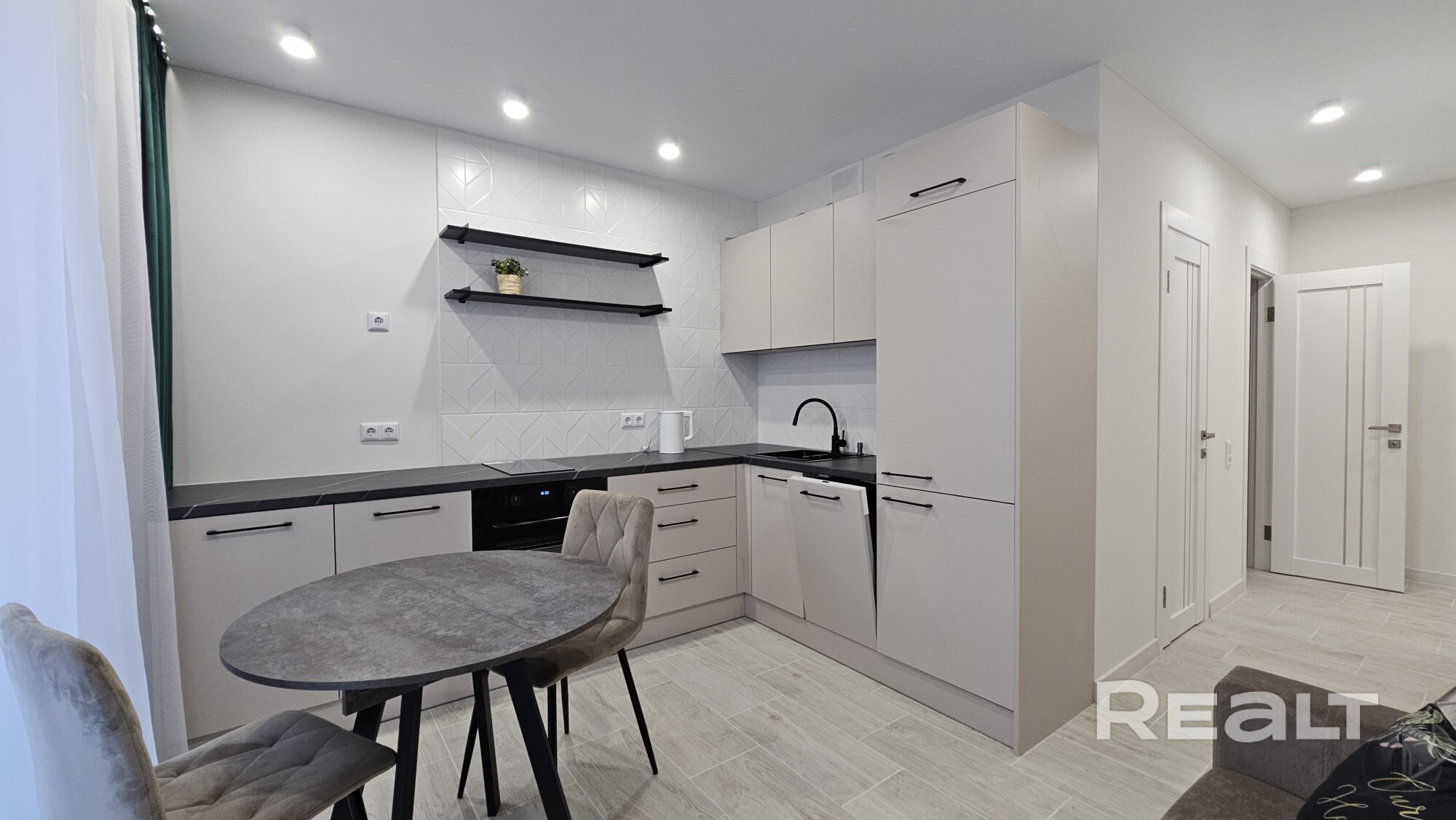 Бытовая техника: стиральная машина, холодильник, духовой шкаф, варочная панель, вытяжка, утюг.