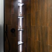 Сан. узел: корпусная мебель, зеркало с подсветкой, полотенцесушитель и душевая кабина.