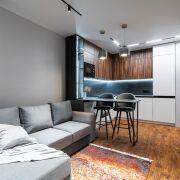Из бытовой техники: 2 кондиционера, телевизор (нет на фото), холодильник, СВЧ-печь, духовой шкаф, индукционная панель, стиральная машина, посудомойка.