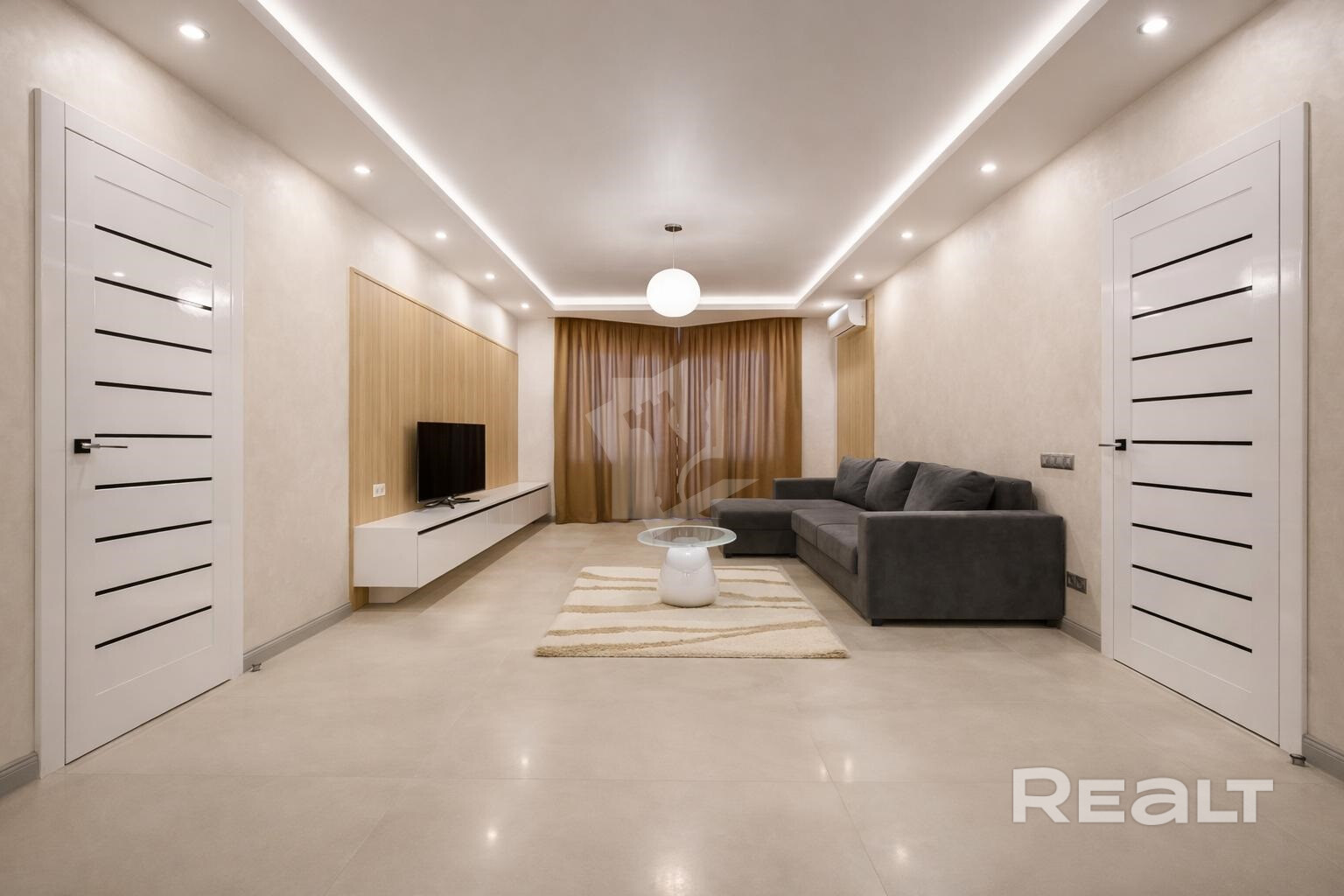 Гостиная зона с диваном, ТВ и рабочим столом у окна