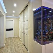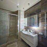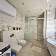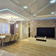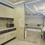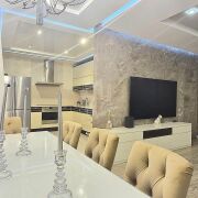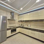 Есть всё необходимое для проживания: варочная панель, духовой шкаф, вытяжка, микроволновая печь, холодильник, посудомоечная машина, стирально-сушильная машина, бойлер, три кондиционера, три телевизора, компьютер.