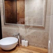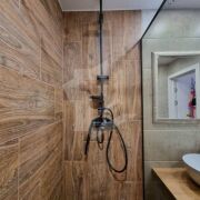 Санузел: Раздельный, с современной душевой системой «тропический дождь» и стильной накладной раковиной-чашей. Отделка плиткой под дерево и натуральный камень.