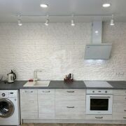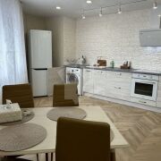 Кухня-гостиная: Просторная кухонная зона с белоснежными фасадами и встроенной техникой (варочная панель, духовой шкаф, вытяжка). Установлена стиральная машина. Обеденная группа с мягкими стульями идеально подходит как для завтраков, так и для работы за ноутбуком.