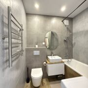 Санузел облицован плиткой, установлена инсталляция, подвесной унитаз, ванна, стиральная машинка, зеркало.