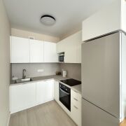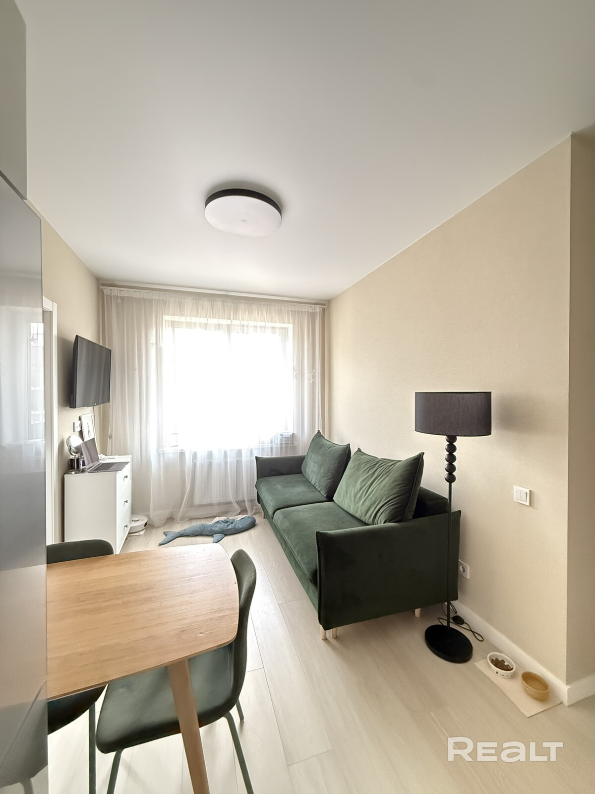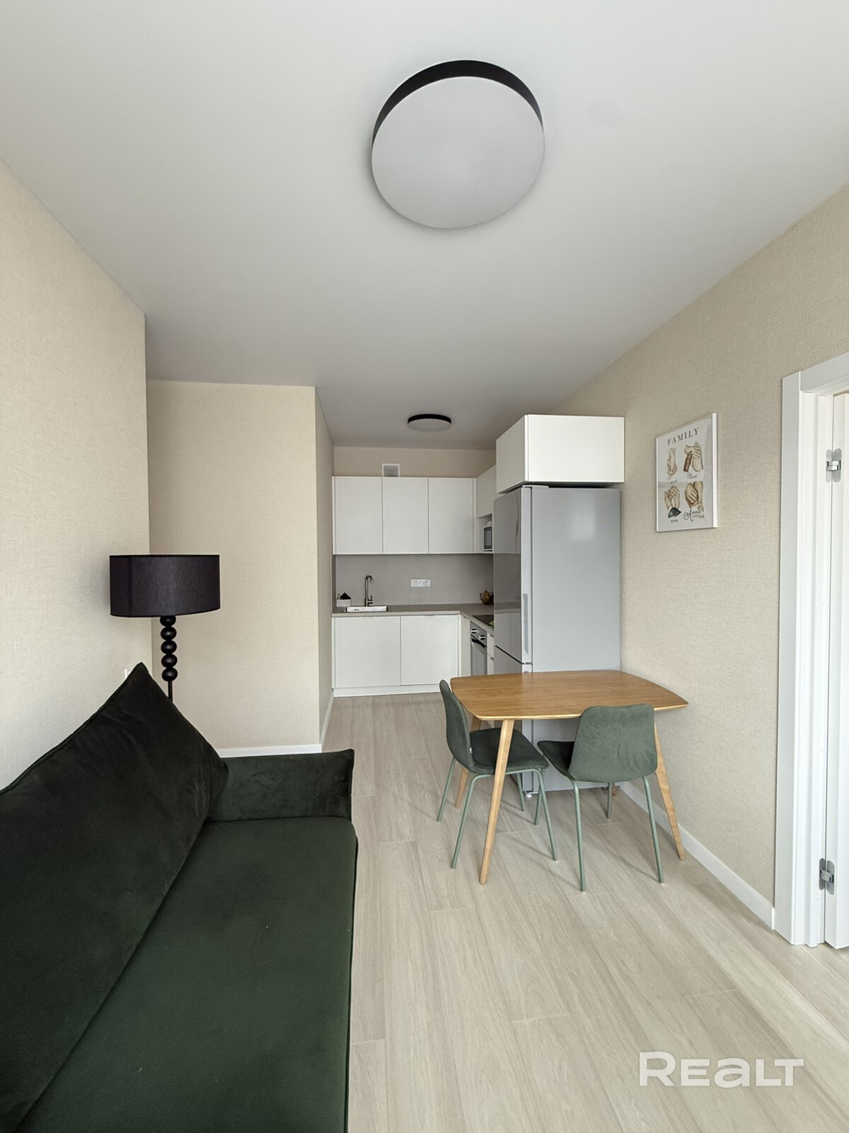 Кухня-гостиная оборудована встроенной кухней с доводчиками и техникой (духовой шкаф, варочная поверхность, вытяжка, посудомоечная машинка, холодильник). Установлена подсветка рабочей зоны, диван.