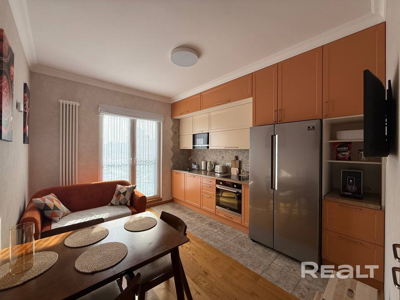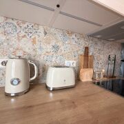 Бытовая техника: кофемашина, чайник, тостер, блендер + телевизор.