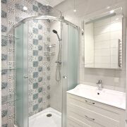 Облицован плиткой, инсталляция, подвесной унитаз, гигиенический душ, душевая кабина, тумба с доводчиками, накладная раковина, зеркало.