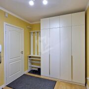 Прихожая: Просторный холл с огромным встроенным шкафом-купе и функциональной открытой системой хранения для верхней одежды и обуви.