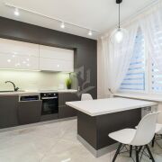 Современная кухня оборудована встроенной бытовой техникой ведущего бренда MAUNFELD: духовой шкаф, индукционная варочная панель, микроволновая печь, холодильник, посудомоечная машина.