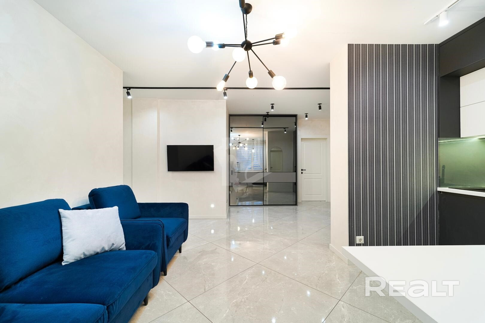 напольное покрытие комнат – немецкий ламинат , кухня и коридор – широкоформатная испанская плитка;